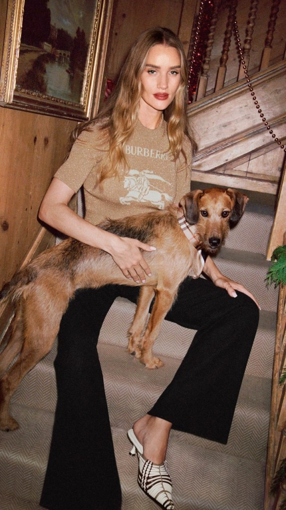 • Rosie Huntington-Whiteley poartă Fitzrovia trench scurt, realizat în Castleford, Yorkshire – o reinterpretare a clasicului cu o fustă amplă și nasturi metalici gravați cu blazonul Burberry și unicorni.